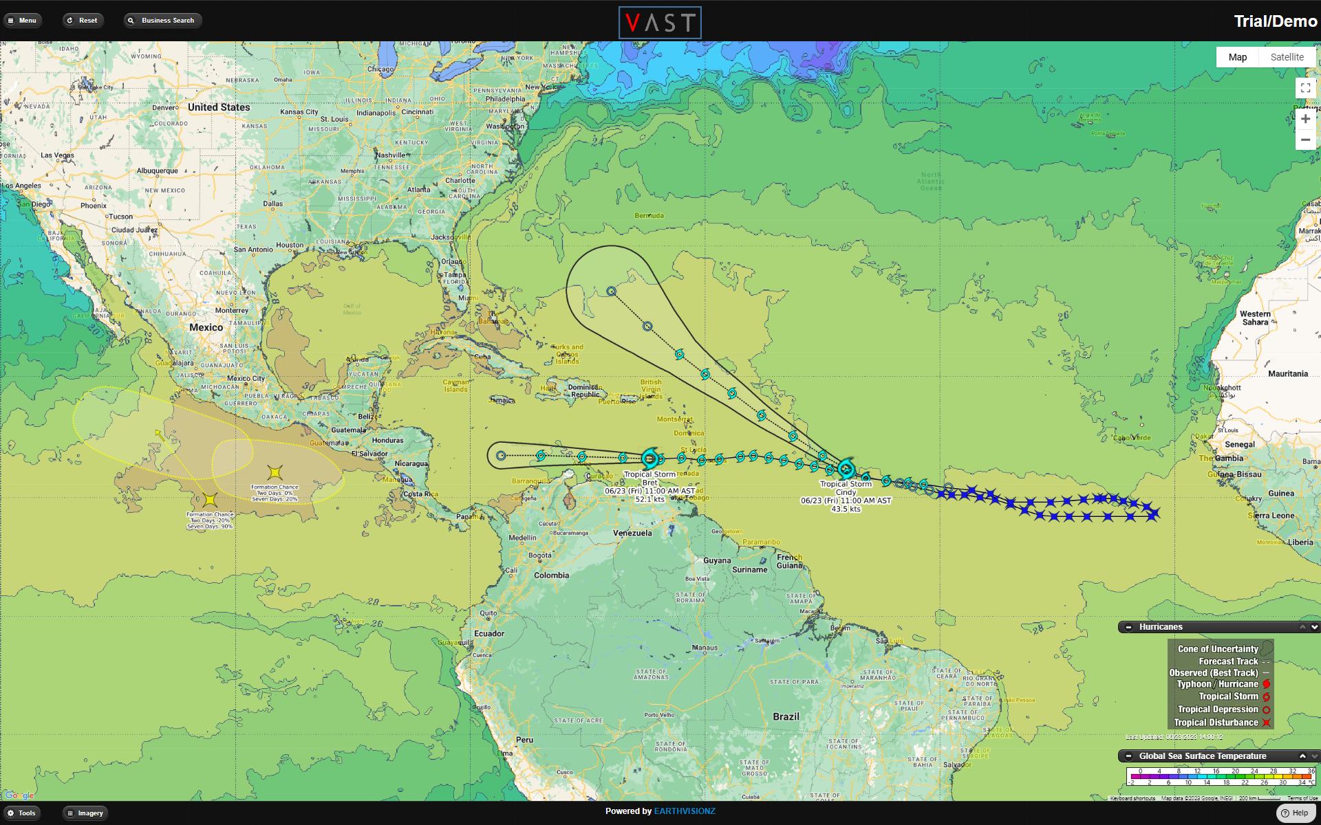Using the hurricane layer and the sea surface temperature layer on Earthvisionz' VAST platform, you can observe that a significant portion of the hurricane formation areas in the Gulf of Mexico and the Caribbean experienced temperatures ranging between 28 and 32 degrees Celsius (82 and 90 degrees Fahrenheit) in June of 2023.